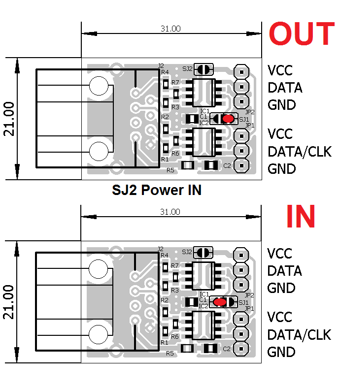 - mit einem Modul können 2 TTL Signale gesendet/empfangen werden (zwei Datenleitungen oder eine Datenleitung und eine Clock Leitung)